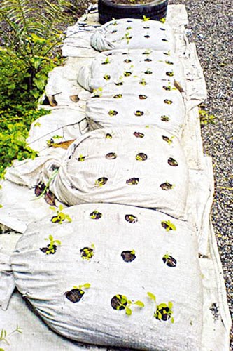 ก่อนที่จะใส่วัสดุปลูกลงในกระสอบนั้น ผู้ปลูกจะต้องรู้ก่อนว่าจะปลูกผักชนิดใด เพื่อใส่ดินให้เหมาะกับชนิดผักนั้น ๆ เช่น ถ้าปลูกผักที่มีรากยาว อย่างพริก, มะเขือเทศ, มะเขือเปราะ, มะเขือยาว ฯลฯ เราก็ต้องพับหรือม้วนปากกระสอบลงมาแล้วใส่ดินปลูกให้สูง 20-25 ซม. ถ้าปลูกผักที่มีรากสั้น อย่างผักกินใบ พวกคะน้า, กวางตุ้ง, ฮ่องเต้ ฯลฯ ก็ใส่ดินน้อยลงมา ให้สูงสัก 10-15 เซนติเมตร แต่การวางกระสอบในแนวตั้งจะทำให้ได้พื้นที่ในการปลูกน้อยแนะนำให้ใช้วิธีการ ใส่ดินในกระสอบประมาณครึ่งกระสอบแล้วมัดปากกระสอบด้วยเชือก วางกระสอบให้นอนลง จากนั้นก็ทำการเจาะรูที่กระสอบ อุปกรณ์ในการเจาะ หากระป๋องปลากระป๋องมาทาบแล้วใช้มีดคัตเตอร์ตัดเป็นวงกลม เพื่อให้ หยอดเมล็ดผักได้ โดยจำนวนรูที่เจาะก็ตามความเหมาะสมประมาณ 9-12 รู แล้วแต่ขนาดของกระสอบ จากนั้นนำเมล็ดผักมาหยอดปลูกได้ทันที รดน้ำเช้า-เย็น เมื่อต้นผักงอก มีใบจริง 2-3 ใบ ก็ให้รดน้ำหมักชีวภาพ.